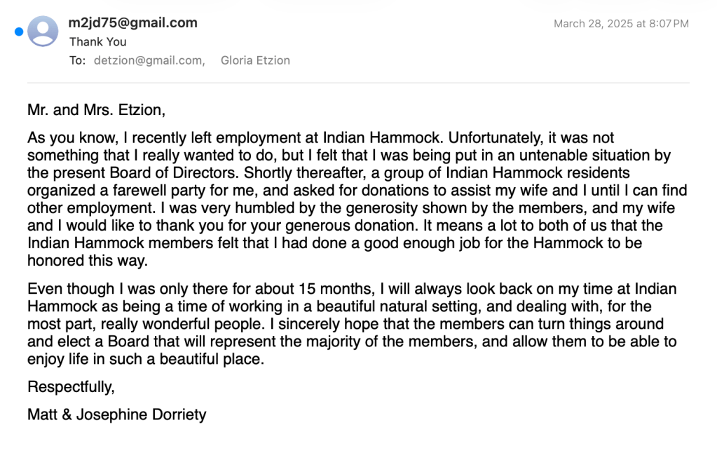 - The subsequent email from Barbara Roberts was sent to clarify community rumors that Mr. Dorriety had been fired, stating instead that he had resigned.